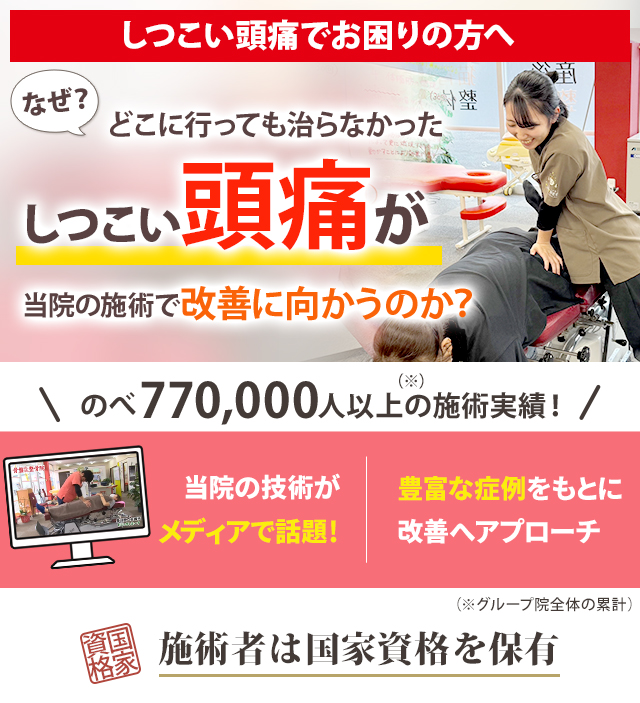 頭痛はまず「頭痛の原因」を取り除いてから「頭痛に併発する諸症状」にアプローチする必要があるため、頻繁に来院していただくことが改善への近道です。